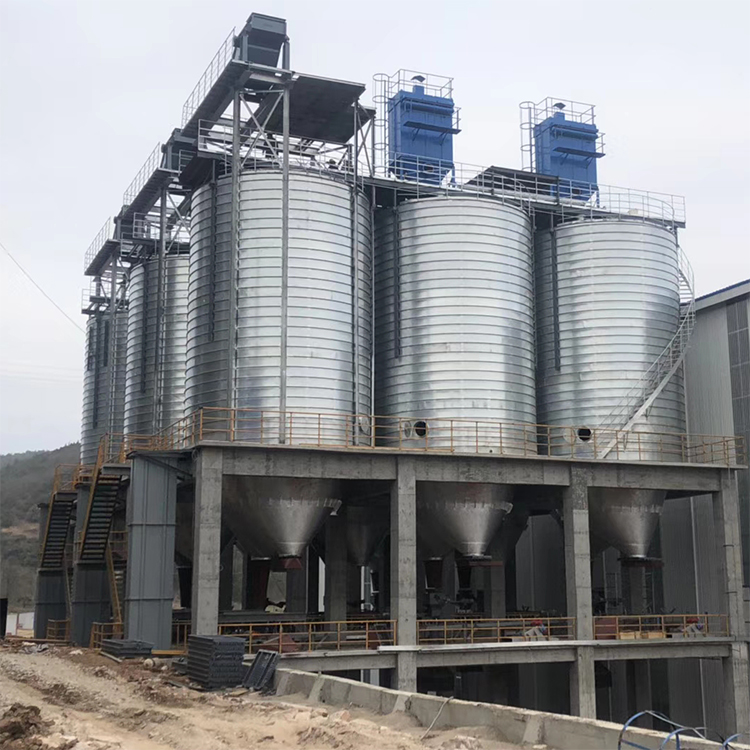 接收与清理设置在筒仓中央该形式筒仓一般采用对称排列,提升机井架固定,经过提升后的物料通过仓顶溜管进人筒仓。这种形式省去了仓顶输送设备和上通廊,从而节省了建造费用,缩短了建造工期。对于贮存时间要求较长的大型粮库,则应根据物料的流向、场地情况、工艺要求等合理地配置投料口、工作塔、烘干塔及日照钢板仓的位置。国华钢板仓介绍了这几种常见的进料形式,实际中可将各种形式相互组合,相互渗透,根据实际情况合理搭配,灵活选用。